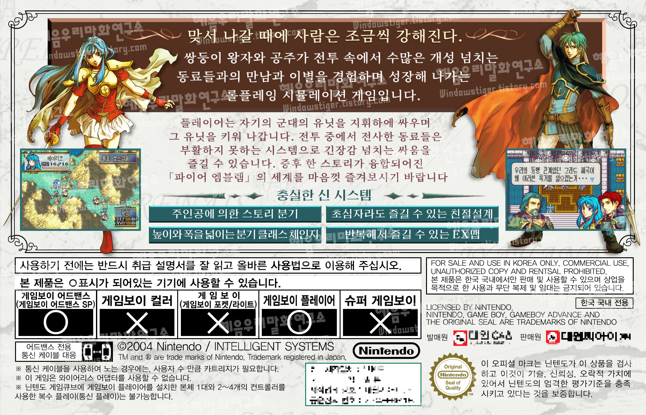 1. 해당글에서는 파이어 엠블렘 성마의 광석의"한글패치 파일"을 배포하고 있습니다. 2. 해당버전은 언제든지 임의로업데이트가 될 수가 있습니다. 3. 본 패치를 필자의 허락을 받고 링크까지 포함해 다른 사이트에 올리는 것을 허용하지만,무단으로 배포하는 것을 금지합니다. 4. 본 패치는 Xdelta 패쳐를 이용하여원본롬에 패치를 해야하며, 이는 인터넷에서 검색하여서 찾을수 있습니다. 5. 버그 또는 오역, 오타가 있을 경우 댓글을 통해 알려주세요. 6. 롬의 용랑 확장으로 인해 일부 에뮬레이터에서 동작 오류를 일으킬수 있습니다. 이럴경우 롬의 용량을 32MByte로 확장시켜 주세요.